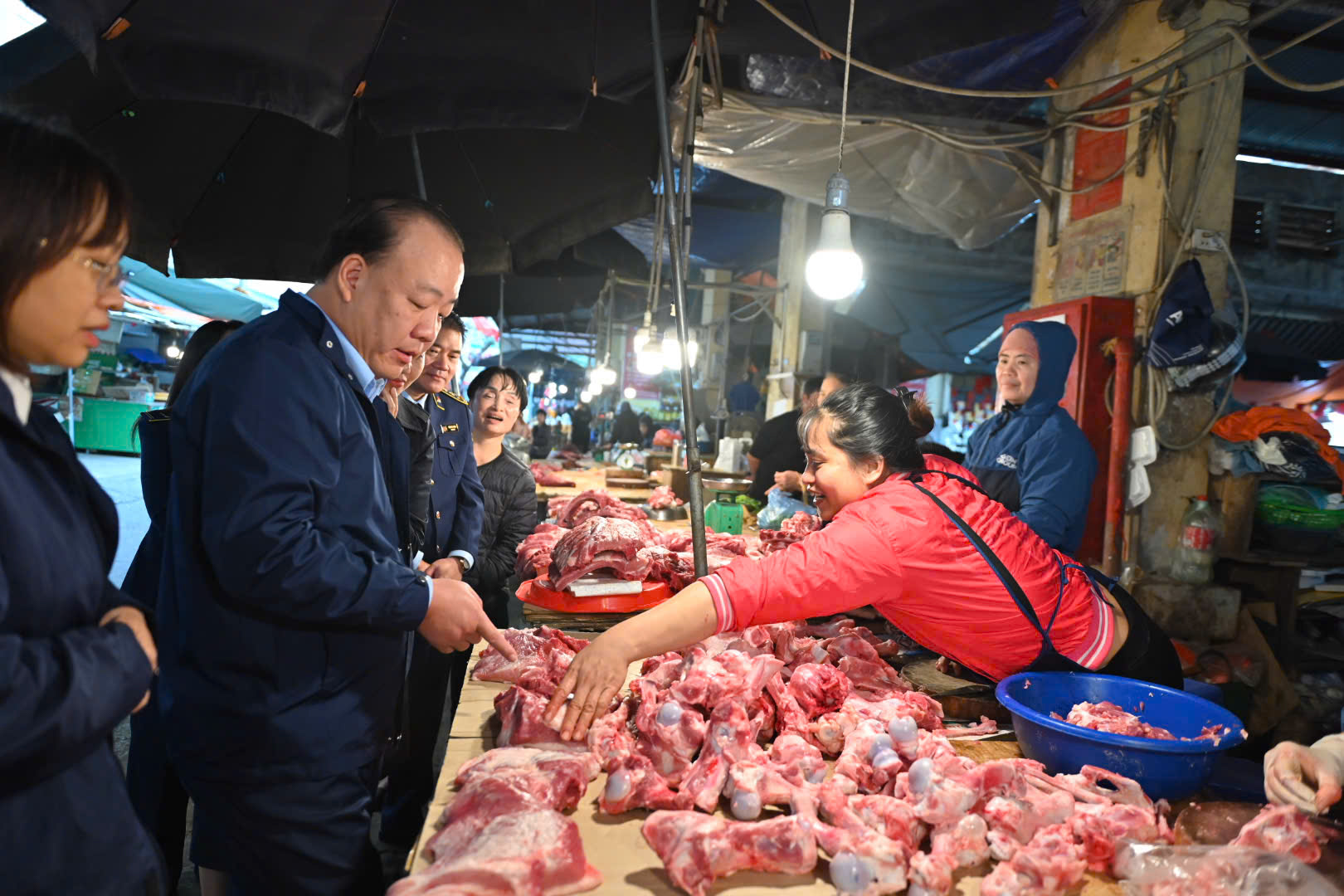 Đoàn khảo sát tại khu vực kinh doanh thịt lợn trong chợ Hà Đông